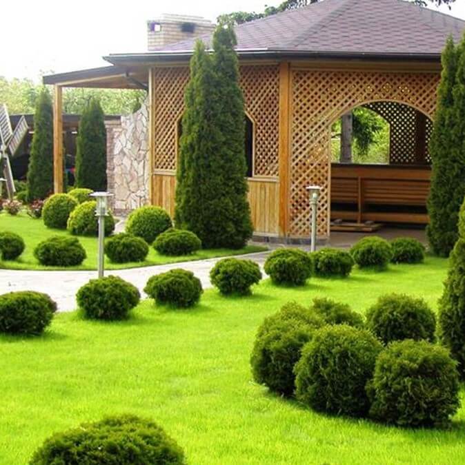 Укладка тротуарной плитки, устройство дренажных систем, укладка газонов, посадка туй и кустарников, сооружение искусственных водоемов.